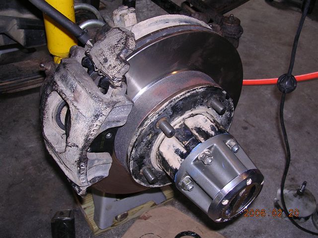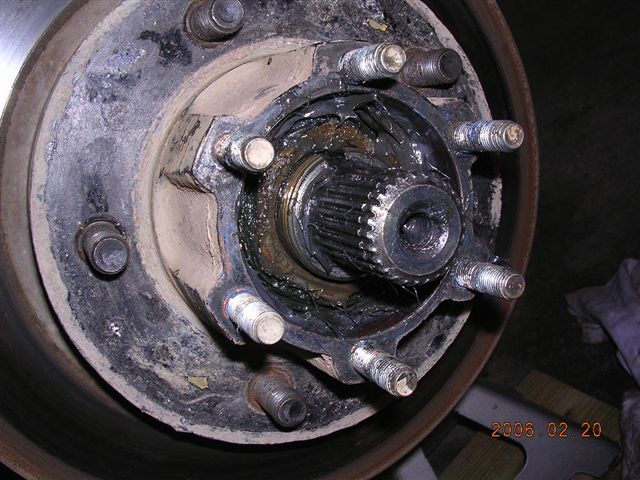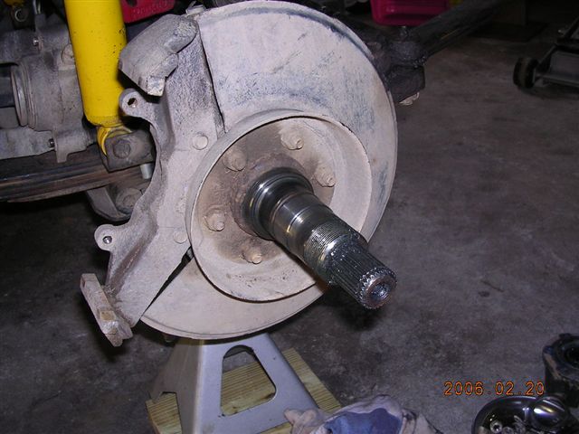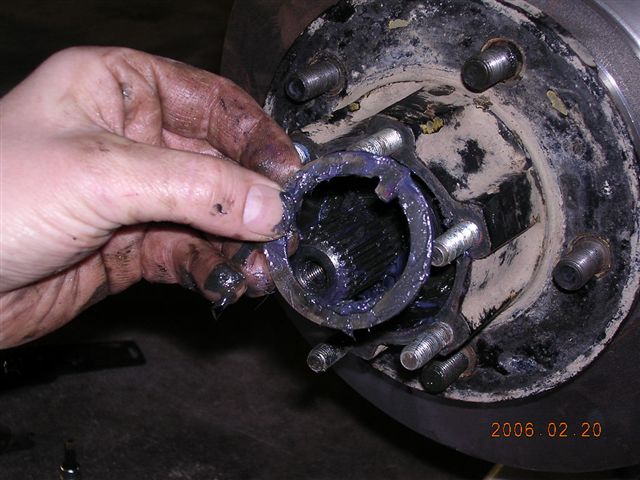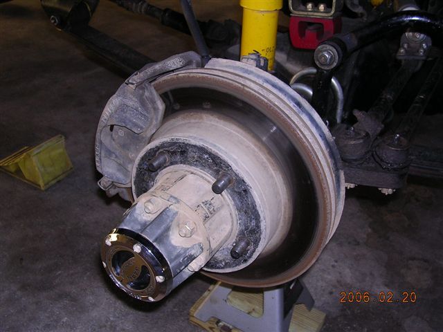 - Remove the hub assembly. This Jeep is equipped with Warn Premium lockout hubs. They are removed by removing the end cap, removing the axle snap ring, then removing the hub gear assembly.